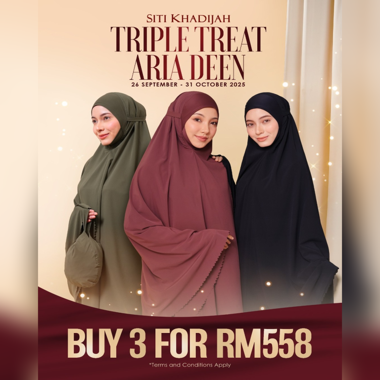 ✨ TRIPLE TREAT ARIA DEEN ✨ 3 telekung premium hanya RM558! 😍 Kualiti Siti Khadijah yang eksklus…